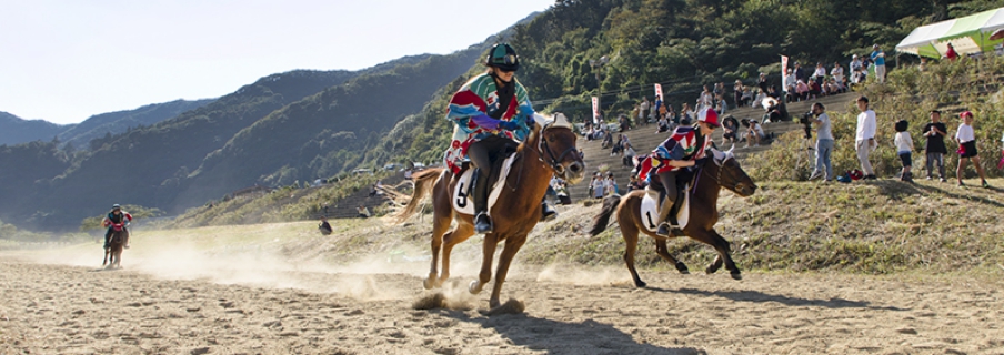 対馬では昔から旧暦6月の午の日に「初午祭」という祭事が行われていました。これは2~3歳の男児を馬に乗せ健やかな成長を願うことと五穀豊穣を祈るもので、そのときの余興として各家庭で飼育されていた対州馬を競わせる競馬「馬跳ばせ」も各地で行われていました。