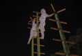 「おー!当ったぁー!」60m程離れた的に矢が当ると、桟敷席の観衆から嬉しそうな声が上がりました。今回の島のお祭りは、江戸時代から続く神事で、大漁豊作、商売繁盛、無病息災などを祈願して弓を射る百手祭りをご紹介します。
