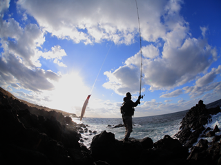 五島の釣りといえば、なんといっても、クロ(めじな)や石鯛釣りが人気。長崎や福岡をはじめ全国から週末になると多くの客がやってきます。一方最近では「ルアー」という小魚に似せた疑似餌を使った釣りもひそかに人気となっています。五島のルアー釣りで一番のターゲットが「ヒラスズキ」。銀色に輝く魚体が美しく、大きいものは、1メートル近くになります。海が時化た日の、しかも荒磯でしか釣れず、その強烈な力の強さから全国のルアー釣りファン憧れの魚として知られています。