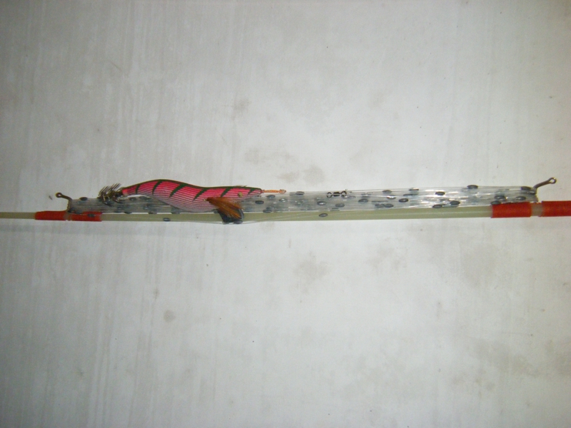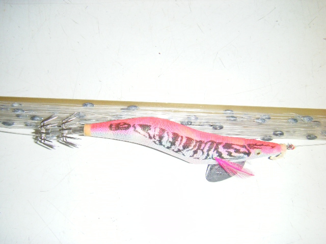 イカ引きには、餌の代わりに、写真(左・右下)のようなエギングを使うそうです。エギングとは、擬似餌のことです。いろんな色や形のエギングがあるんですね。ギザギザのトゲがいっぱいあるところに、イカの足を引っ掛けて、釣りあげるのが、イカ引きの醍醐味だそうです。