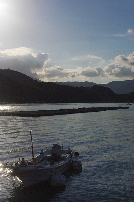 さてさて、お話を聞いた漁協の目の前にある戸石漁港をブラブラ。カキの養殖イカダを見に行ってみましたよ。戸石の対岸に浮かぶ牧島に渡る橋のすぐ近くで、3つのうちの1つの漁場を発見! なるほど、ここだったらシケに合うこともありませんね。