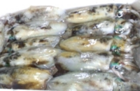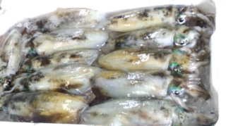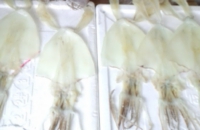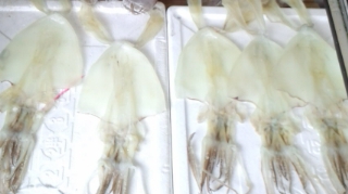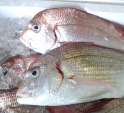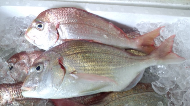 この日はあまり魚の種類がなかったのですが、今日の一押しはチコ鯛!手前の大きい方がちょうど1kgありましたよ。身が少し柔らかいので、お刺身よりも焼いて食べると美味しいそうです。うろこがピカピカ光ってきれいでしょ!つづいて、今一番獲れている魚は、前回もご紹介した水イカです。