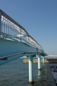 この公園のシンボル的存在の水色の橋。遠くからも見えるので目印にもなります。釣り場施設へは、この橋をてくてく歩いて渡ります。わりと高い位置にあるので、高所恐怖症の方は思わぬところで度胸試し!?
