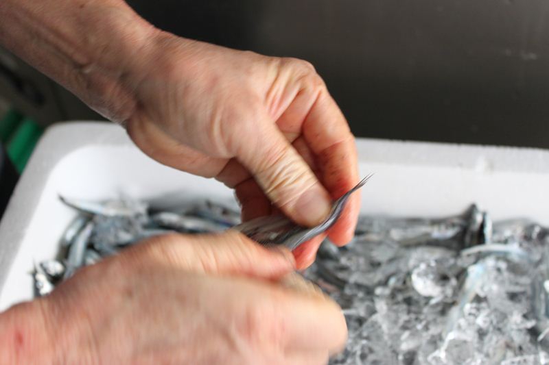 話を戻しますね。「魚食らべれる?」と、奥さまが、きんなごを慣れた手つきでおびいてくれました。