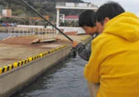 早速、防波堤へ向かいみなさんの様子をこっそりチェック。バッチリ装備で釣る人もいれば、気軽に釣っている地元っ子らしきみんなも。そんな光景に興味を持ったのが同行していた小学校三年生の甥っ子でした。「僕も釣りたい!」。とは言え、釣り道具はナシ…。どうしようか?と考えていたら、港近くに釣具屋さんを発見。