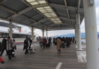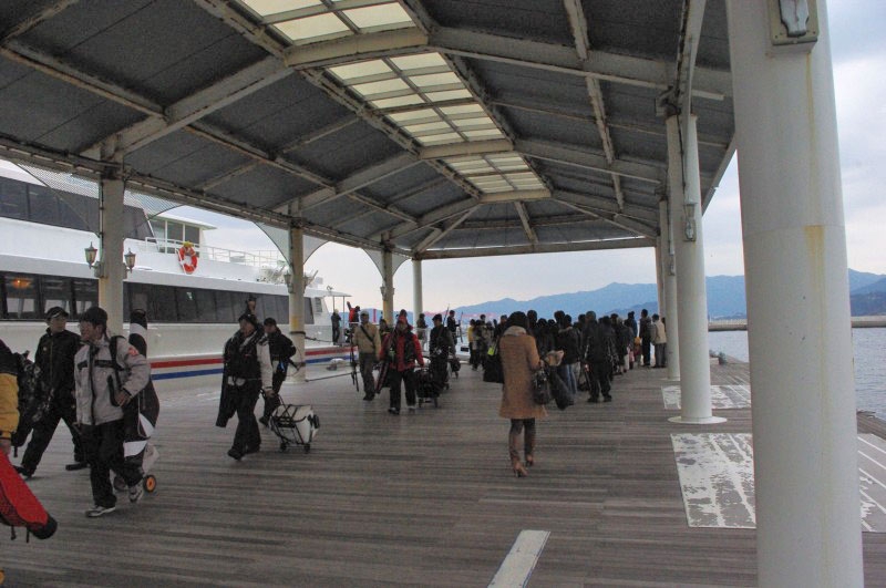 「家に持ち帰ってエビを食べさせて育てる」という無謀な甥っ子を何とか納得させ、釣った魚はバイバイと再び海へ帰すことに。桟橋を見ると伊王島の隣にある「高島」からの船が到着。船からはたくさんの釣り人が下りてきました。