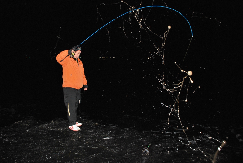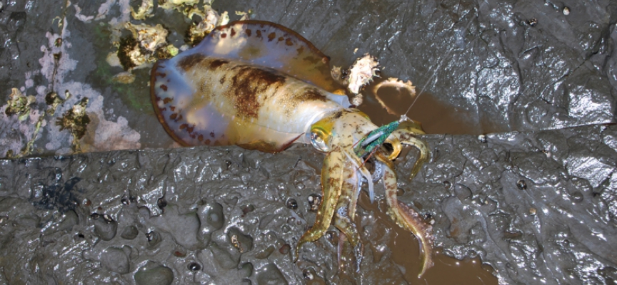 そして2投目を投げ入れ5分ほどでまた、「掛かったよ」の声が。カメラを構えてミズイカを釣り上げる瞬間を・・・