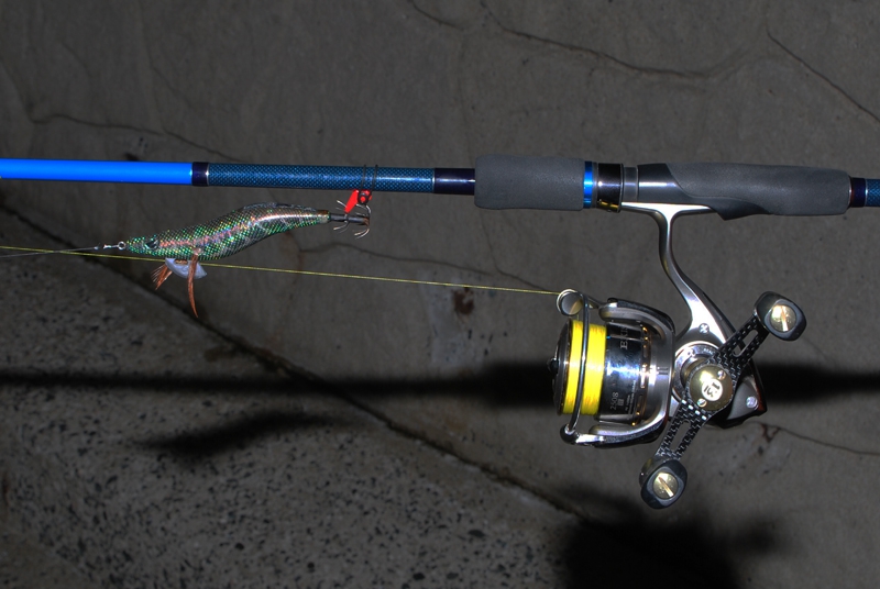 エギングとは、餌木(えぎ)と呼ばれる疑似餌でアオリイカやヤリイカなどを釣る手法で波止からでも気軽に出来、道具も簡単なことから人気の釣りです。道具を見せてもらっても短い竿とリールと餌木だけととってもシンプル。釣り方も竿を振って餌木を海中に投げ入れしゃくるだけととっても簡単そうに見えました。(イカはしゃくっているときではなく、餌木が沈んでいるときに掛かることが多いそうです)