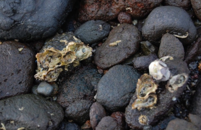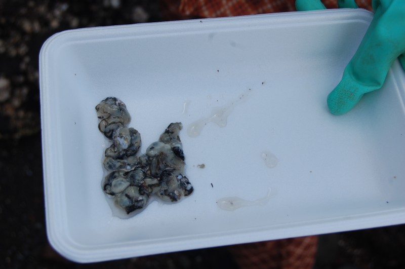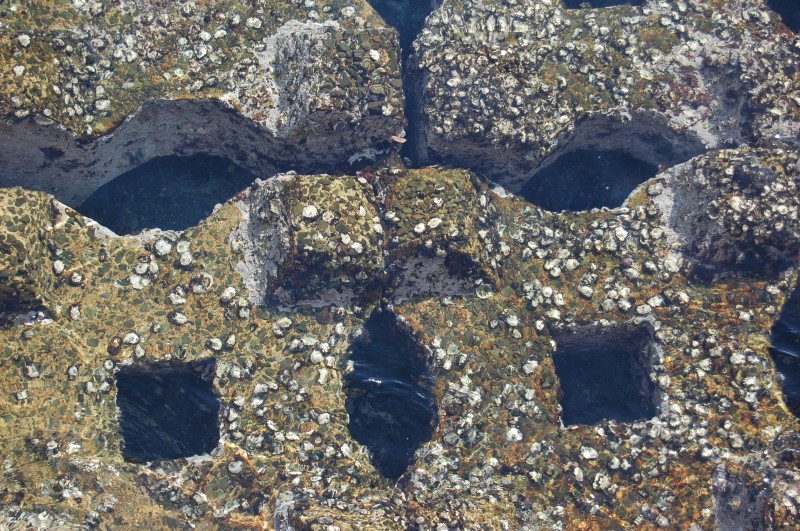 獲ったセッカはザルに入れ、海水できれいに洗って出来上がり!本当はもっと岩場の難しい場所の方が誰も取れなくて、たくさんいるそうです。 波の荒くない場所で、栄養分の多い海なら、どこにでも付いているセッカ。防波堤の漁礁にしてあるテトラポットにも、びっしり付いていました。