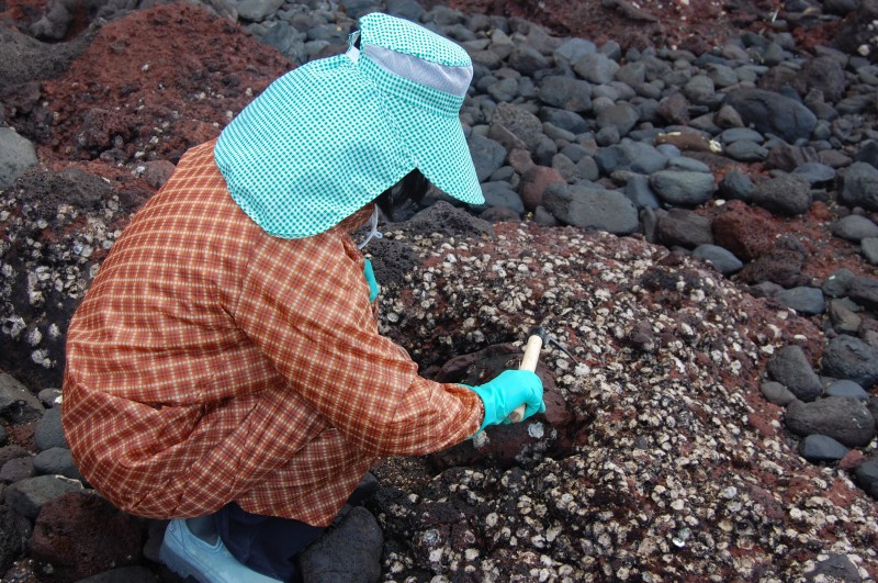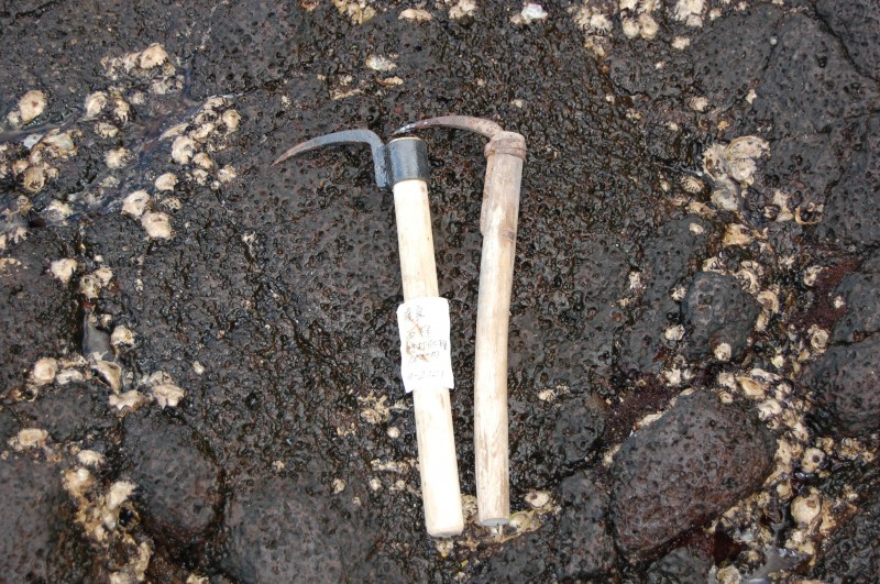 さて、セッカの打ち方ですが、尖った道具の先の方で、3センチくらいの小さな殻の端の方を打ちます。間違って、殻の真ん中を打つと、中側の潮水と殻が顔に直撃!なかなか上手くいきません。おまけに、冷たい海からの風は、全身を凍らせ、思ったように打つことだ出来ませんでした。今回は、ちょっとだけ獲れました。