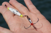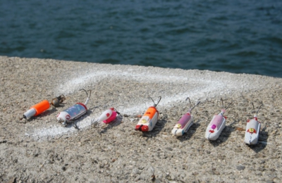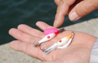 こちらは既製品におもり部分(ピンクのところ)を手作りしてつけたタイプ。疑似餌作りのパーツは、釣具屋さんだけでなく、100円ショップで調達したりするとか。疑似餌のキラキラ部分に、キラキラの折り紙を使用したり、なんとマニキュア!?を塗ったり。ナイスアイディア!ですね。
