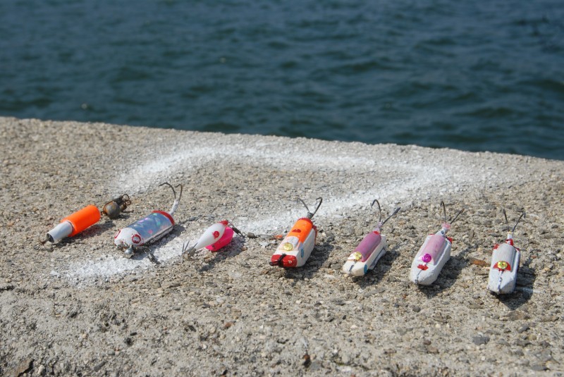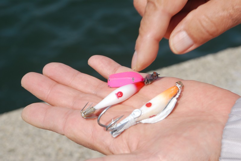 「釣果が一番良かった疑似餌はどれですか?」と質問したところ「コレとコレかな」といって並べ直してくれました。右が1位、左が2位。この色、この形にイイダコくんはグッくるようです。