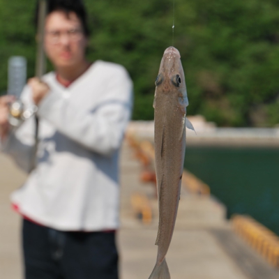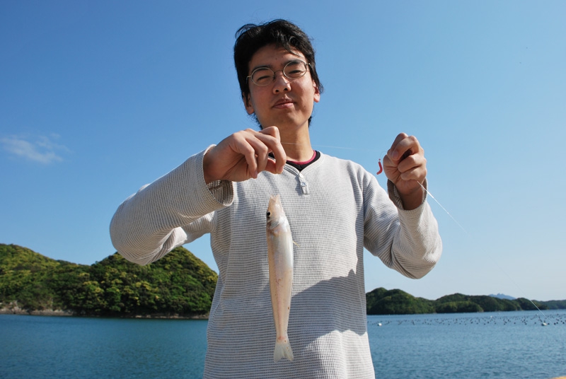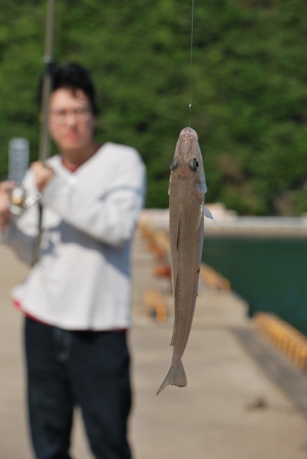 しばらくして息子が「反応が無いね」と言うので、交代してゆっくりリールを巻くと、コツコツと魚の反応が。「魚がきてるよ」と再度、息子にバトンタッチ。