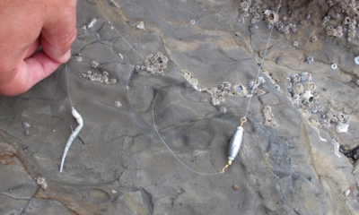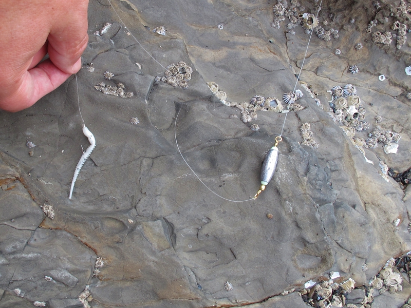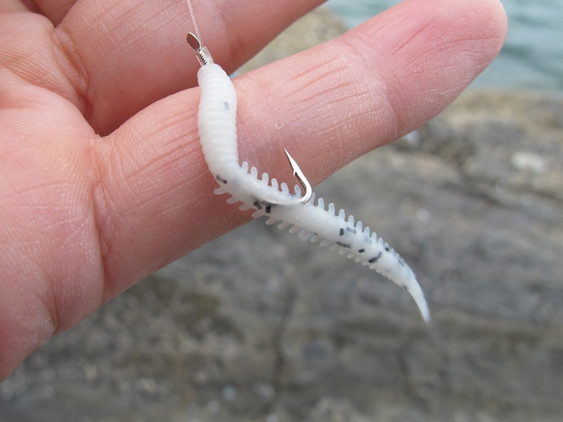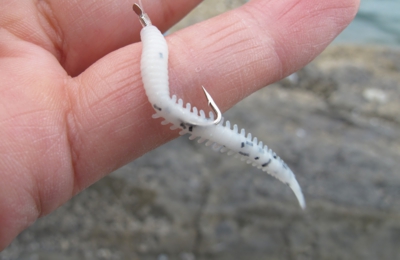 両側に釣糸を結びつけるサルカンが付いたオモリに普通の釣針をつなぎ、ソフトルアーをセット。こうすることでオモリが釣針より先に海底に沈み、根掛かりしにくくなりました。あとは、メバルを釣るだけ。といってもメバリング初心者の私にはメバルがいる場所や釣れる時間帯など解らないので、とりあえず仕掛けをポチャンと投げて様子をみます。