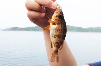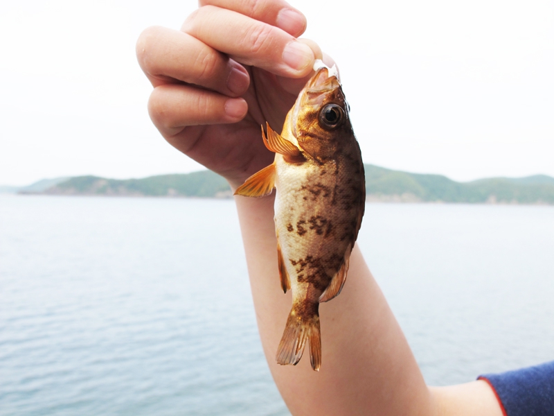 オモリが沈んだところで、竿先を軽くしゃくってメバルにアピール。3回ほどしゃくったときに、ググッとアタリがきました。ワクワクしながら巻き上げてみると、小さいながらメバルです。