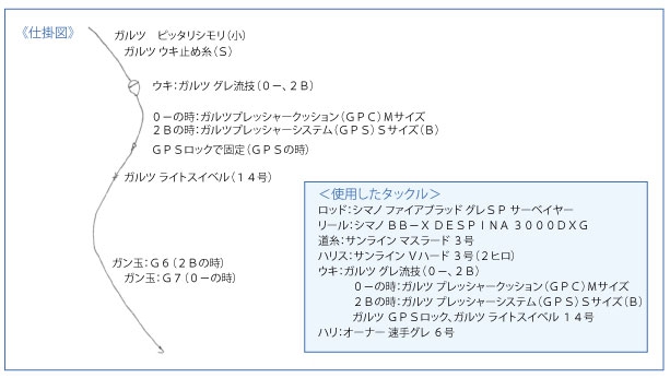 早速、購入してきたボイルとオキアミ生を海水に浸してから仕掛けの準備にとりかかる。浅ダナで当たっているとのことなので、ウキにガルツのグレ流技の0-(マイナス)を使用し、その下にガルツプレッシャークッション(GPC)のMサイズとした。道糸は、サンラインのマスラード3号で、ハリスにはVハード3号を2ヒロとり、ツケエが安定するようハリ上50cmのところにガン玉のG7を付け、ウキ止めは誘導幅をとらず2ヒロのところ結んだ。