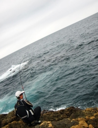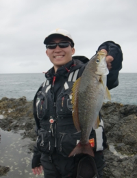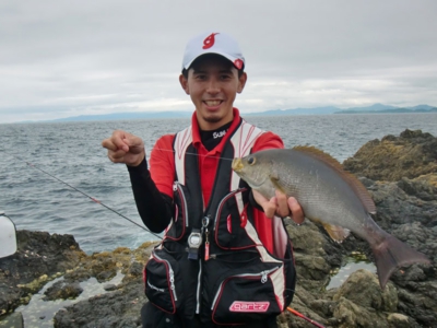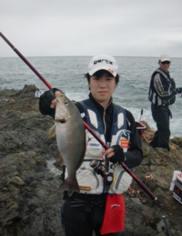 日比野君が仕留めたイサキウネリが残っているので、少し下がったところバッカンを置いてからサラシにパラパラとマキエを撒いてから仕掛けを投入する。サラシにのって沈み瀬方向へと流れていき、沈み瀬の手前から左へと流れていく。数投してもツケエが盗られないので、少しずつタナを深くしていくがアタリはない。しばらくして突端で竿出していた日比野君が竿を曲げ、40cm級のイサキを取り込んだ。続けてイサキを掛けた日比野君だったが取り込み寸前でサメがイサキに食いついて奪われてしまったようだ。
