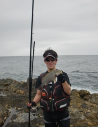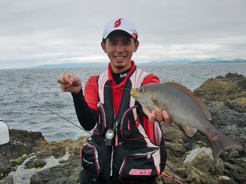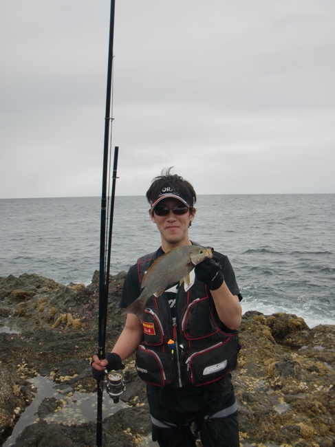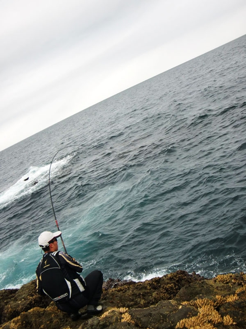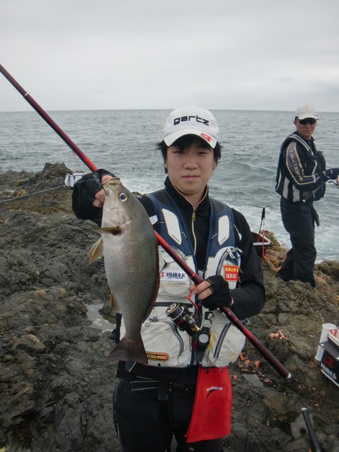 藤本君が仕留めたイサキ 足元のサラシにマキエを入れてから、その中に仕掛けを投入する。タナは3ヒロ。マキエのボイルをパラパラとかぶせてから流していく。ウキは足元のサラシから沈み瀬方向へ流れ、沈み瀬の手前から右へと流れていく。