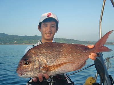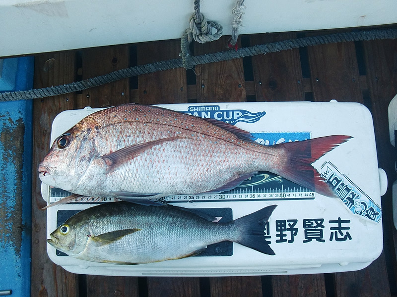 仕掛けを30mほど遠投し、マキエをそれに合わせて遠投する。仕掛けを流していくが、ツケエが残ってくる。ハリスにガン玉のG6を追加して、タナを少しずつ深くしていき、竿1本半としたところで、スプールからパラパラと出ていた道糸が一気に走り出した。竿を立てると、沖へ向かって走っていくので道糸を送って走らせる。少しずつ寄せてくると、竿をコンコンと叩いて首を振る感触が伝わってくる。ゆっくりとやり取りして浮かせたのは、50cmオーバーのマダイで、川上氏にタモ入れしてもらった。(船の上で計測すると、54cmだった。)