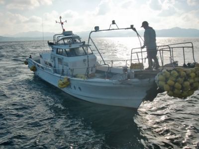 7月20日、釣友の川上氏と長崎港を12時25分に出発するフェリーで五島へと向かう。フェリーには、夏休みに入ったためか大勢のレジャー客が乗船している。フェリーは、予定どおり16時20分に福江港に到着し、買い物などを済ませ、17時30分に地元の渡船「勢幸丸」に乗り込み出港した。