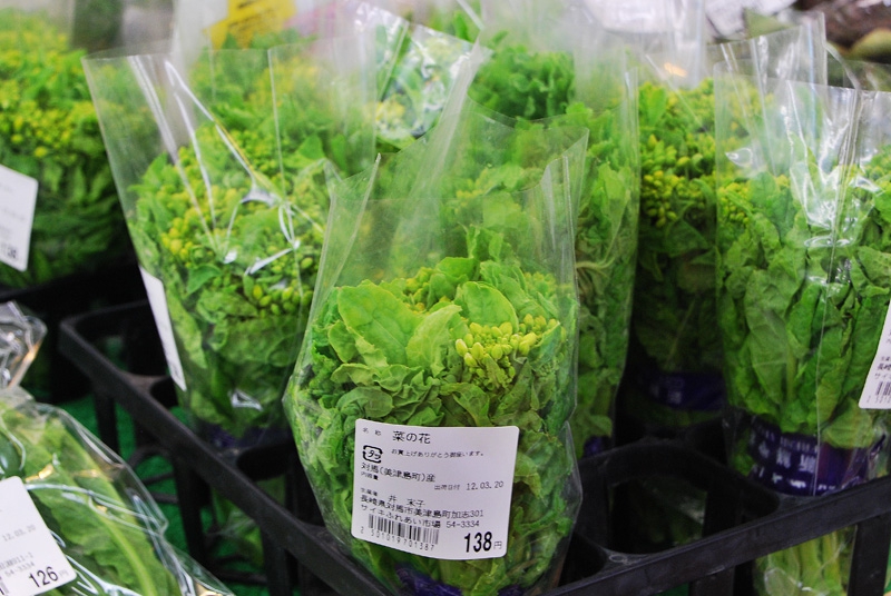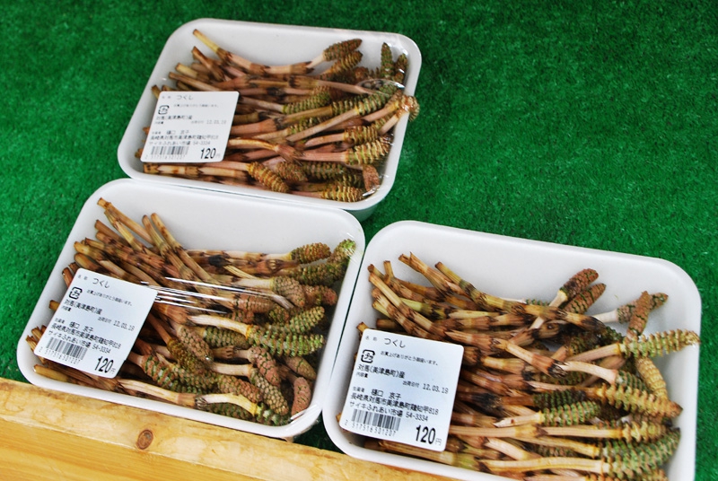 まずは、山の幸から黄色い花を咲かせる菜の花(アブラナ)。おひたしや、からし和え、おからに混ぜたり、味噌汁の具にしたりと多様な料理に使われますね。また道端にあるつくしも販売されていました。こちらは玉子とじやキンピラで食べることが多いです。