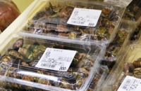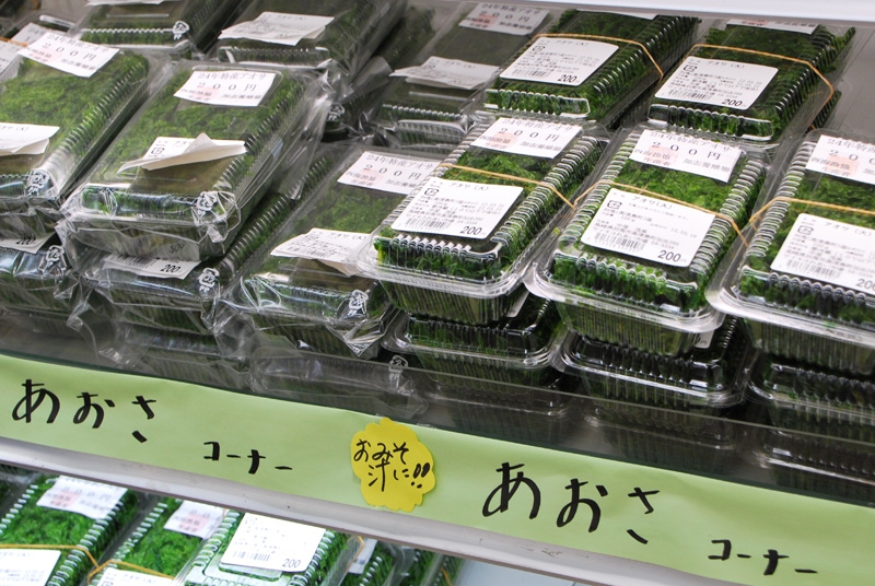 海の幸では、オガミゼという貝が売られていました。私が子供の頃はカメノテと言って磯の岩の間に郡生していて採り放題でした。味噌汁に入れると良い出汁が出て磯の香りとともに楽しめます。次は海草のあおさ。こちらも子供の頃は磯にへばりついていたのを剥がして採っていましたが、近年は島内各所で養殖されています。こちらも味噌汁に入れると美味しい味と香りが楽しめます。