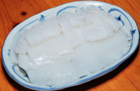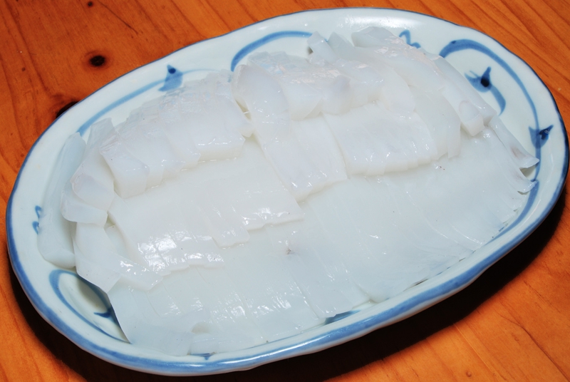 ミズイカ(アオリイカ)のお刺身は、身が厚く甘くねっとりしてとっても美味。こんなに新鮮で美味しいイカが食べられるのも対馬ならでは。