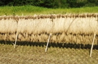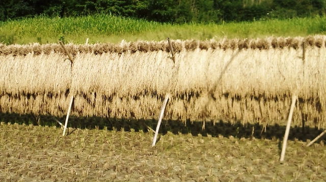 この時期、多くの田んぼで掛け干しされています。天日干しされた壱岐の米は、甘みが増してきます。大変手のかかる米作り。以前は、隣保班の人が共同で農作業を行い、