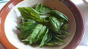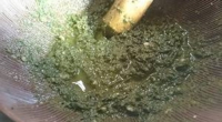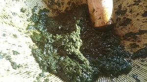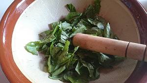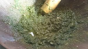 我が家、というか「小さな村」の農園ではいろんな種類のハーブも栽培しています。とは言っても、ハーブ(なんか)もともと雑草みたいなもんだから、種をまけば、ほっといてもワンサカ生えてきます。今回は、バジルを使ってイタリアンでよく使われる香味料のひとつ、バジルペーストを作りました。(家内が・・・)まず、葉を摘んで良く洗います。ハーブ系は摘んでも摘んでもどんどん生えてきますよ。なにしろもともとは雑草だから。良く水気を切ってから、根性を入れてすり鉢で摩り下ろします。ここまでがんばります。(もちろん家内が・・・)
