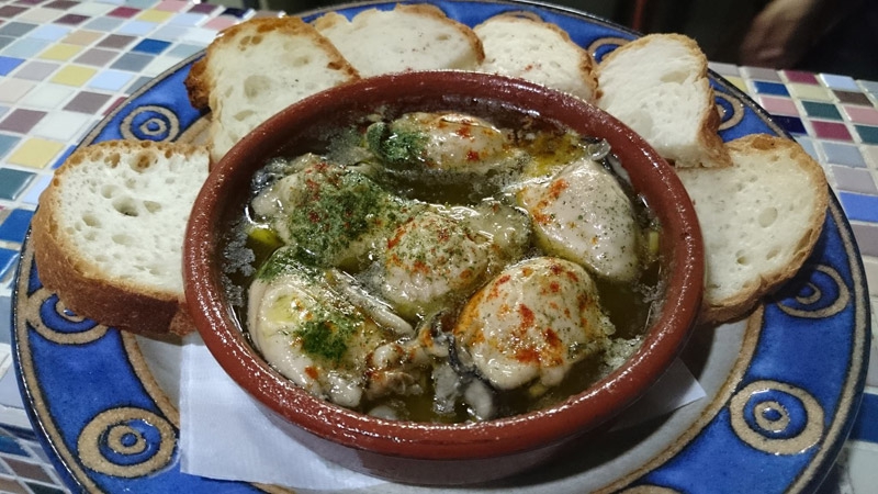 スペインのバル(居酒屋)での人気おつまみです。ワインとの相性が抜群ですけど、日本酒熱燗もなかなかイケテます。ただし、ものすごく熱くなるまで煮立てるので、専用のアヒージョ鍋じゃないと途中で割れる可能性大です。そこで、今この時期の瞬の食材と言えば「牡蠣」!「牡蠣」のアヒージョです。五島には、特産の石花(せっか)という小さい粒の岩牡蠣がありますが、アヒージョには不向きなので、大粒の久賀島産の牡蠣です。