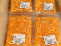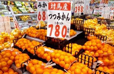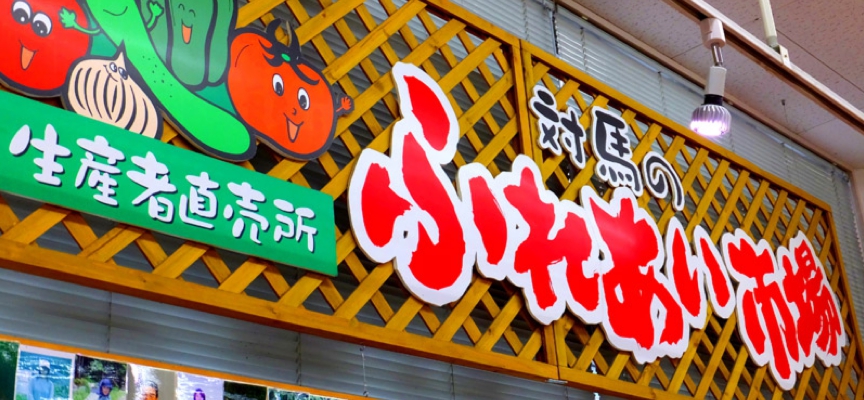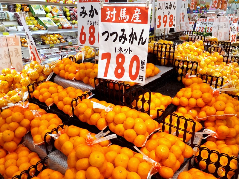 今回は、美津島町のスーパーサイキ内にある地元生産者直売所の「対馬のふれあい市場」へと行って来ました。ふれあい市場は対馬で採れた山菜や海の幸から野菜やパン、お菓子などが地元の生産者の方々から出品されている市場です。写真は「豆酘(つつ)みかん」対馬の南端にある豆酘で栽培されているみかんで、小ぶりで酸味が強く爽やかな味わいです。