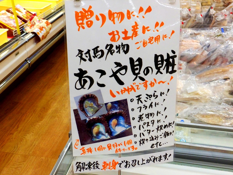 また、対馬では昔から真珠養殖が盛んで、この時期になると真珠の養殖に使う「あこや貝」の貝柱が市場に並びます。ホタテ貝の貝柱と違い小さいけれど、掻き揚げやシチューの具などにすると貝柱の濃厚な旨味を味わう事ができます。対馬ならではの商品に興味がある方は是非足を運んでみてはどうでしょうか!!