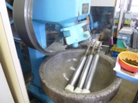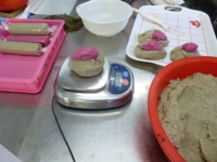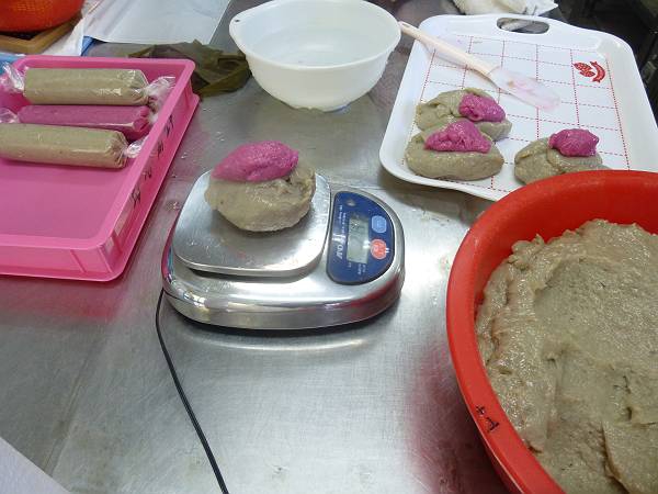これがすり身を作るマシーン。臼の直径はざっと1㍍弱。この後は全て手作業です。これがすり身。原料はアジ100%。これにいろんな調味料や色粉をつけたりして量りに乗っているのが1本分です。