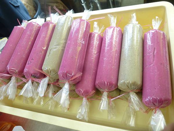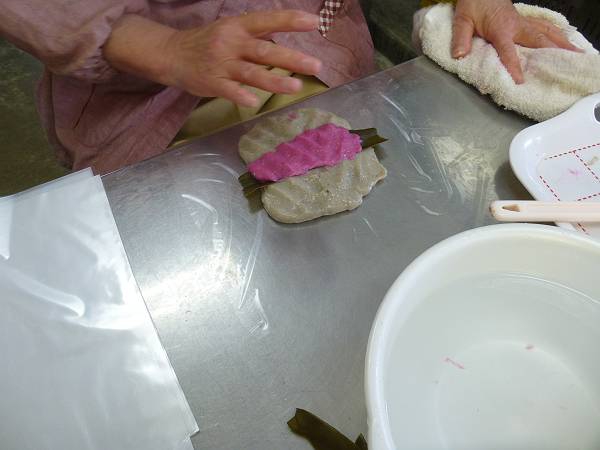 昔は漁師さんの家ではほとんど手作りで作っていました。 昆布が入っていないタイプや色がついていないタイプ、いろいろあるんですが私的には、色粉できれいなピンク色プラス昆布入りの、このタイプが一番のお気に入りです。