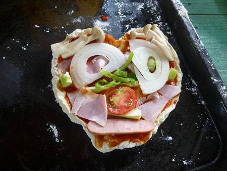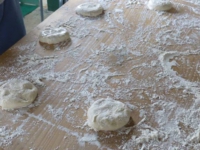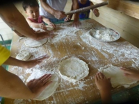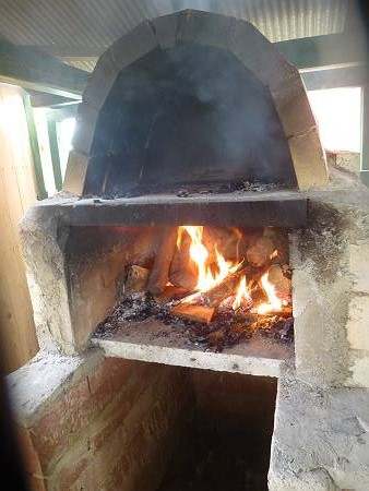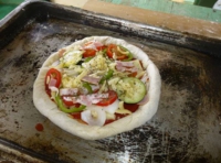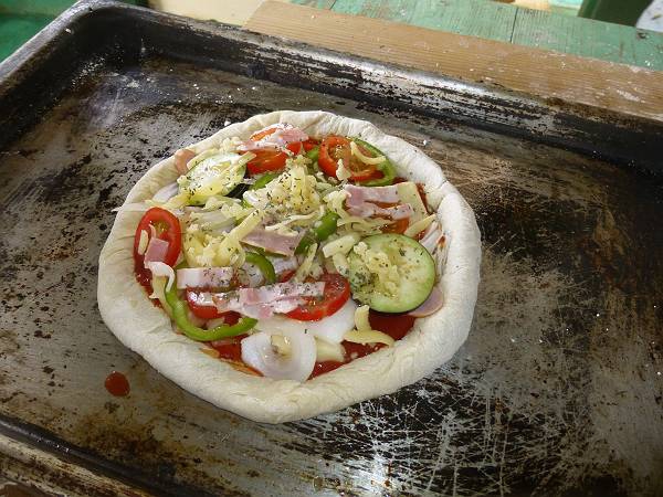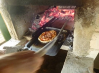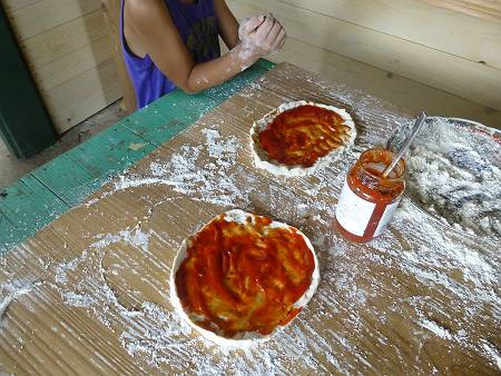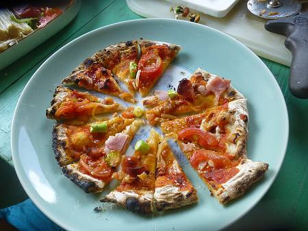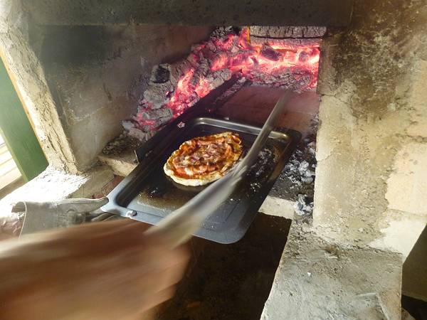 島でピザを焼く。 なんちゃって地中海気分。見よう見まねの手作りピザ釜ですが(見た目はさて置き)薪を燃やして炉内の温度を約400度まで熱します。火床は大谷石です。上では余熱を利用してパンが焼けます。ちなみに400度の温度は炉の入口に手を差し込んだら瞬間にアチチとなる温度です。温度が上がるのを待つあいだに、前夜から仕込んで発酵させた生地を丸く伸ばします。僕にもできました。ピザソース(残念ながら市販品)を塗って