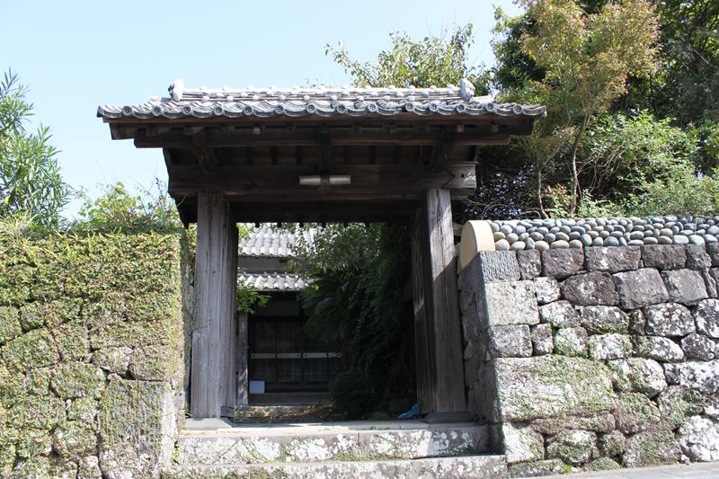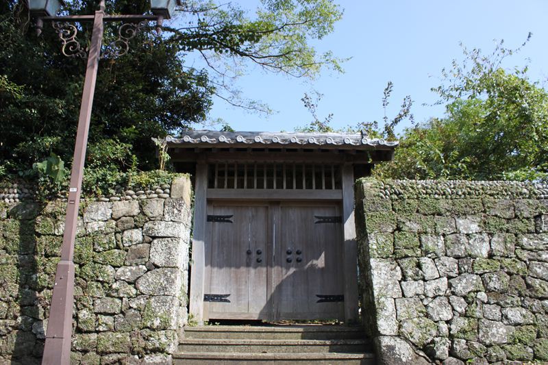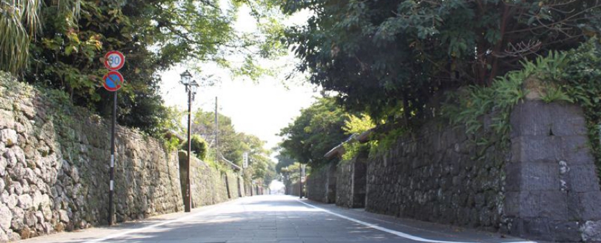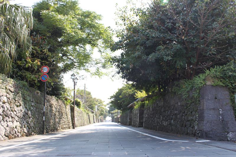 両側には石垣の塀があり、まっすぐ伸びたこの通り。なんとも、風情豊かな雰囲気だと思いませんか?ここは、福江港から10分ほど歩いた場所にある武家屋敷通りです。寛永11年(1634)に第22代藩主・五島盛利公が各地に散らばっていた豪族や五島藩士170余家を福江に移住させました。その時、中級階級武士が住んでいたといわれるのが、今回、私が歩いた武家屋敷通りです。全長約400メートルの石垣は、保存状態がよく全国でも珍しいそうです。