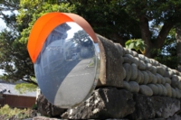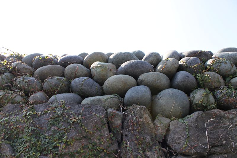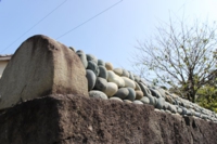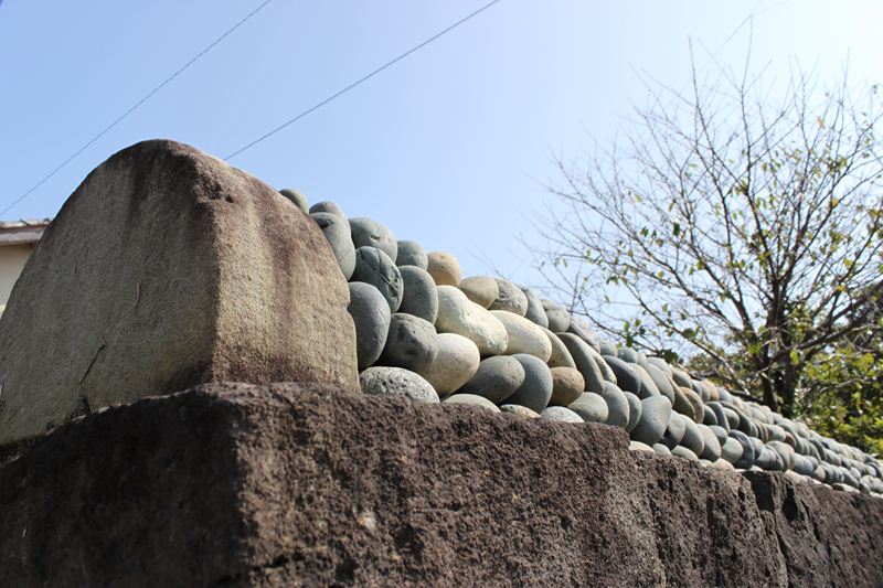 石垣の塀には、こぼれ石と呼ばれる丸い石が積み重ねられています。その両端を蒲鉾形の石で止めてあるのが特徴です。こぼれ石は、一説には外部から石垣の塀を登ってくる侵入者が、積み上げている石を落した時にでる音で、侵入を知らせたりする役目だったといわれています。外部からの侵入の音がこぼれ石でわかるくらい、昔は音が少なかったんですね。あと、いざという時に、武器として使用されたともいわれています。いざという時に使うにしては、少し大きくてコントロールが難しいと思ってしまうのは私だけでしょうか・・・