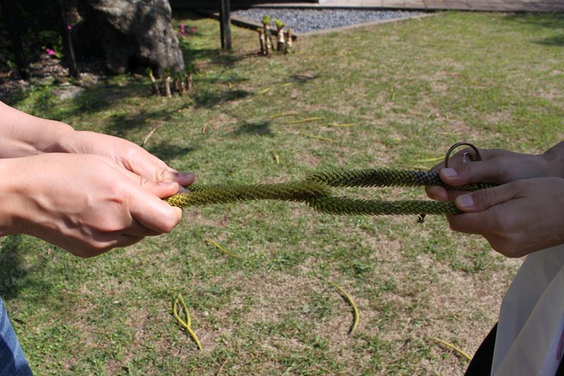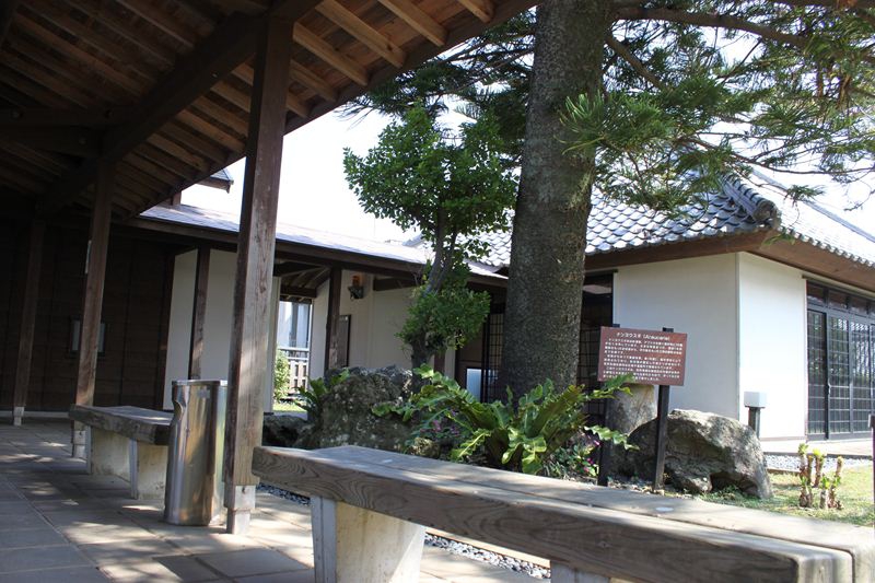 さらに中へ入って行くと、立派なナンヨウスギの木が目に入ってきました。このナンヨウスギは、旧所有者の薩摩氏の先祖が台湾から鉢植えとして持ち込まれたもので、かつては2本あったそうですが、1本は台風で倒木したそうです。落ちている葉を使って、引っ張り合いっこ遊びもできますよ。大きな木の下で、ベンチに座り風情豊かな建物を眺めているだけで心が落ち着くようです。ベンチ横にある体験コーナーでは、五島伝統民芸バラモン凧を気軽に作ることができる「ばらもん絵付け体験」やオリジナルハンカチを作れる「ハンカチ草木染体験」があります。どちらとも要予約になります。世界に1つだけの五島民芸品を作ってみるのも楽しそうですね。