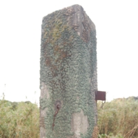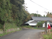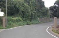 郷ノ浦から沼津方面のバス停「黒崎入口」から、車で5分ほど行くと、右方面「猿岩」左方面「壱岐出合いの村」の看板があります。その分かれ道の右側の道路の両端に門が2本立っています。
