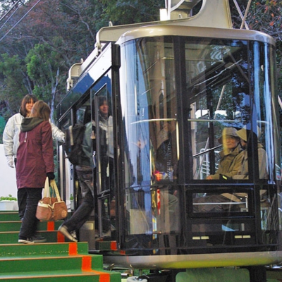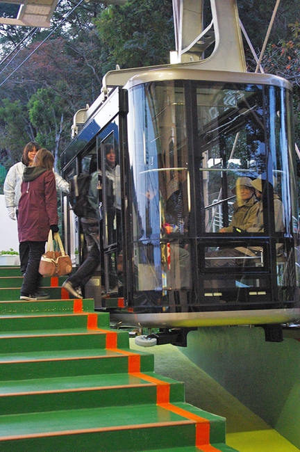 ゴンドラがリニューアルしたのは11月、工業デザイナーの奥山清行さんがデザインしたそうです。奥山さんはなんとあのフェラーリのデザインも手がけられているとか。思わず宙に浮かぶフェラーリをイメージしちゃいましたよ、私。さて早速、ロープウェーの発着地、淵神社駅へ。