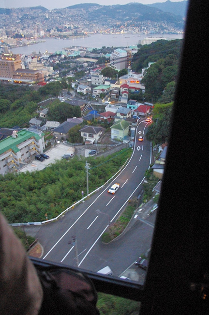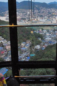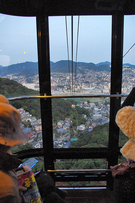 少しずつ斜面を登って行くゴンドラ…。長崎の町や道が足元に……。確かにスケスケだから真下の方までよく見えますねぇ。