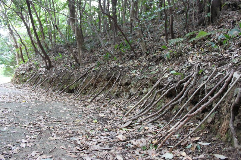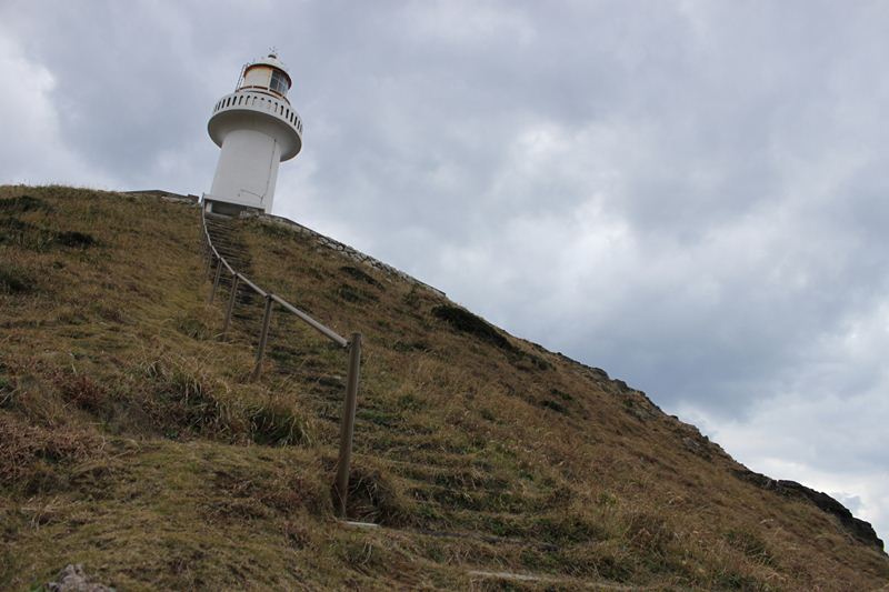 灯台までのコースは遊歩道になっていて、整備されています。とはいえ、遊歩道の横は斜面になっているので気をつけて歩かないといけません。この斜面には、マサキ・ハマビワ・オニャブソテツなどの潮風に強い植物が生育しています。これらが木のトンネルになっていて、強く吹く風を防いでくれます。