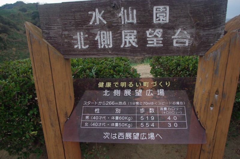 花と香りを楽しみながらズンズン頂上へ。ちょっとした山登り気分も味わえます。やったぁ、「北側展望台」に到着しました。看板によると展望台までの距離を歩くことで30キロカロリー(体重50キロの40代女性の場合)を消費するそうです。調子に乗って「西側展望台」も目指してみることに…。