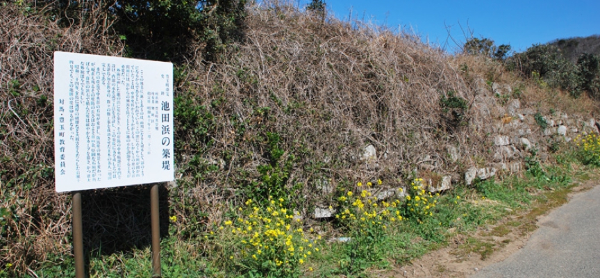池田の浜は対馬中央部の浅茅湾から西に突き出た半島にあり、三面、山に囲われた盆地状で、雨季に冠水すると沼のようになる土地でした。中世から田が開かれていた様子ですが、本格的に開田するには、朝鮮海峡から吹き付ける風波を防ぎ、田の水位を調節する必要がありました。そこで、対馬の数々の難工事を成功させた美津島町加志出身の増田定七が半島の外海に堤防を築き、その中央部には水門を設けました。