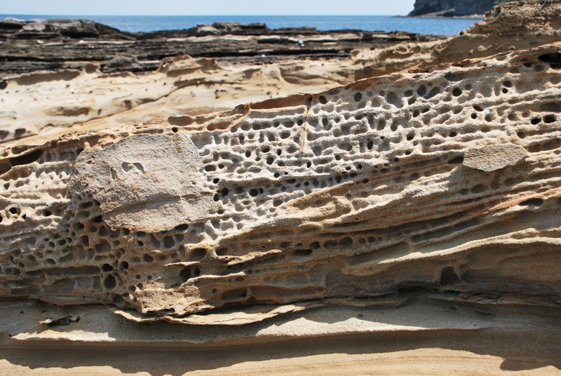 このバス停の奥が砂岩で出来た奇岩郡がある場所で、岩が波や風で削られた形はまるで自然の芸術。