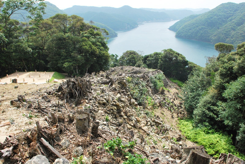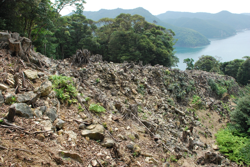 登り始めて20分。眼下に浅茅湾が広がる、見晴らしが良い場所に出ました。さらに歩くこと3分ほどで、三ノ城戸へ到着。山裾へ向かって石塁が続いています。