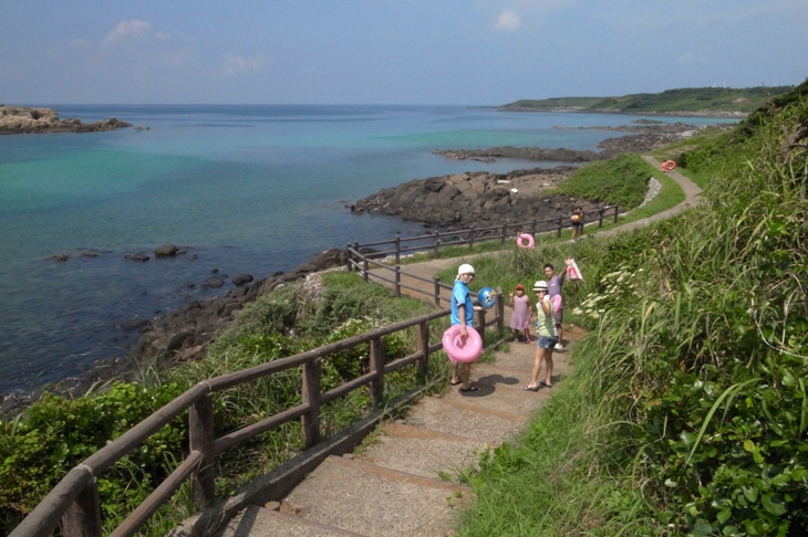 バンガローのある岬からは、海沿いに遊歩道も整備されていて、この道をてくてく歩いていくと、浜田海水浴場という砂浜にたどりつきます。岩肌がつづくこのあたりの海岸に、突然あらわれる小さな砂浜。いつ行ってもプライベートビーチ感覚で楽しめます。