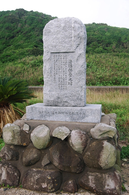 この供養塔は、1986年9月16日未明、2百数十頭のイルカの大群が迷い込み、内128頭が浜辺に打ち上げられていたことを哀れみ悼むために建てられた物です。遠い昔から、鯨やイルカと共存してきた壱岐の島の人々は、わざと殺して喜んでいたのではないということを、この供養塔から感じました。
