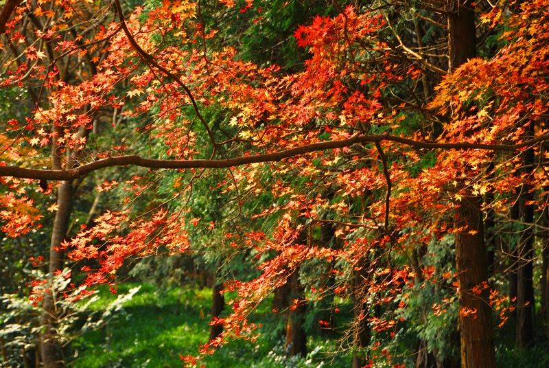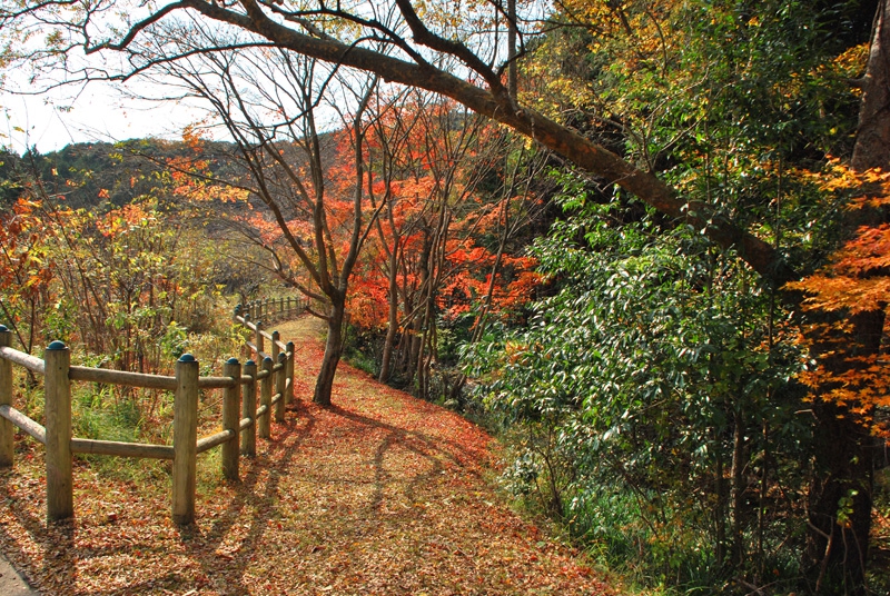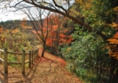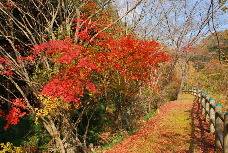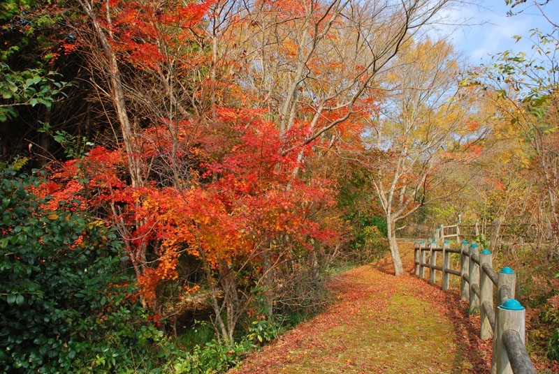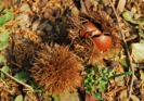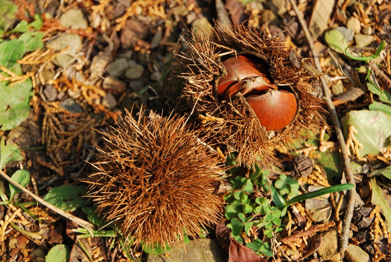 私が訪れたのは11月19日。平日、月曜日の午前中とあって他に来園者は無く、色づいた紅葉のジュウタンの上をのんびりと散策できました。柵の向こう側は栗林が広がっており、散策路に殻つきの栗が落ちていましたよ。