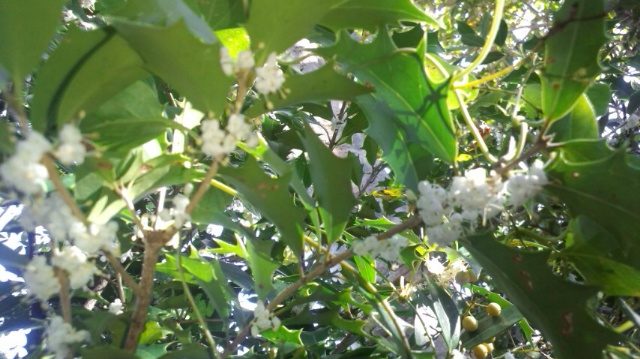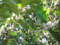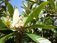 これは、ヒイラギ南天の花です。 毎年白い実を付けますが、あまり目立たないのでいつもは忘れています。でも、この時季になると周辺には優しい香りが漂い、季節を感じさせてくれます。自然の香水をプレゼントされたような気がして、嬉しいものですね。 これは、ビワの花のつぼみです。 チョウも待ちきれないのか?つぼみに止まっていました。 今年の初夏が楽しみです。 私の家の周りをちょっと散歩しただけでもこれだけの植物が息づいています。壱岐の島には四季折々の自然があふれ、私たちの心を和ませてくれます。
